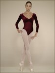 I just love the look of velvet on a leotard. This one is done beautifully with an empire seam dividing the stretch bodice and the velour bust and sleeves. The pinched front creates the slightest hint of a sweetheart neckline. And this leotard is available in all the right colors for bringing out the richness of its fabrics – midnight blue, bordeaux and black.